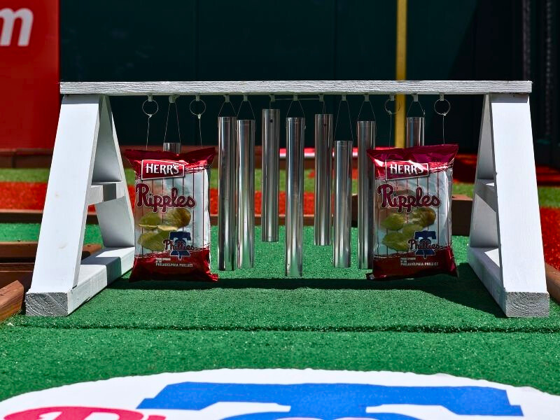 We were once again blessed with a beautiful sunny summer day in late July where our 9 hole course would be installed at the Citizens Phan Field of Citizens Bank Park. Citizens Phan is the wiffle ball field and is the perfect size for creating a custom course. Continuing from earlier in the month with now providing custom colors of turf besides that of green, 6 of the holes for this event were red and the other 3 holes were the traditional green. Holes 1, 5 & 9 were the green holes and these holes each had a Phillies turf logo near the tee area. To start the course, hole 1 was a challenging par 3 with two legs and a branded obstacle that was dangling Herr's potato chip bags to putt through in the first part of the fairways. Hole 5 we labeled the Phillie Phanatic as that was the hole in 2024, where the Phillie Phanatic miraculously was able to get a hole in 1. The last hole of the course was the Skeeball hole which had a branded Skeeball marquee to collect the last shots of the golfers.