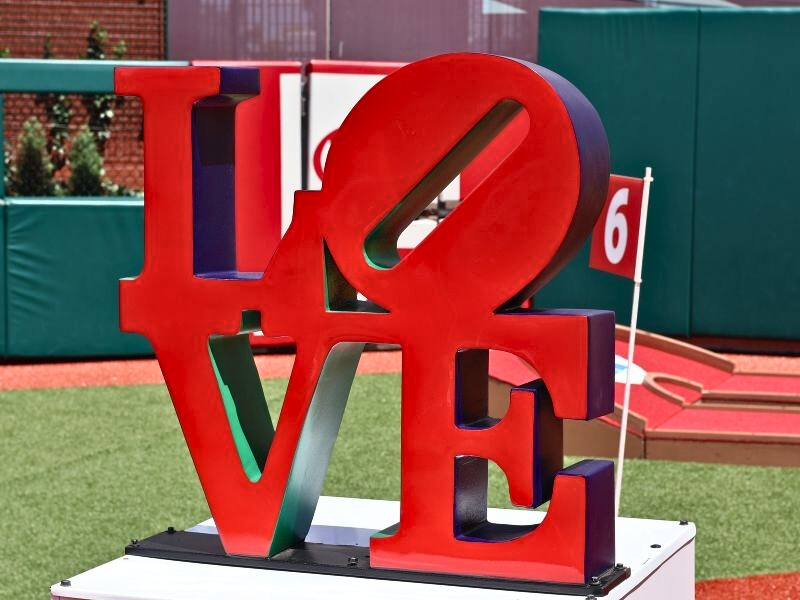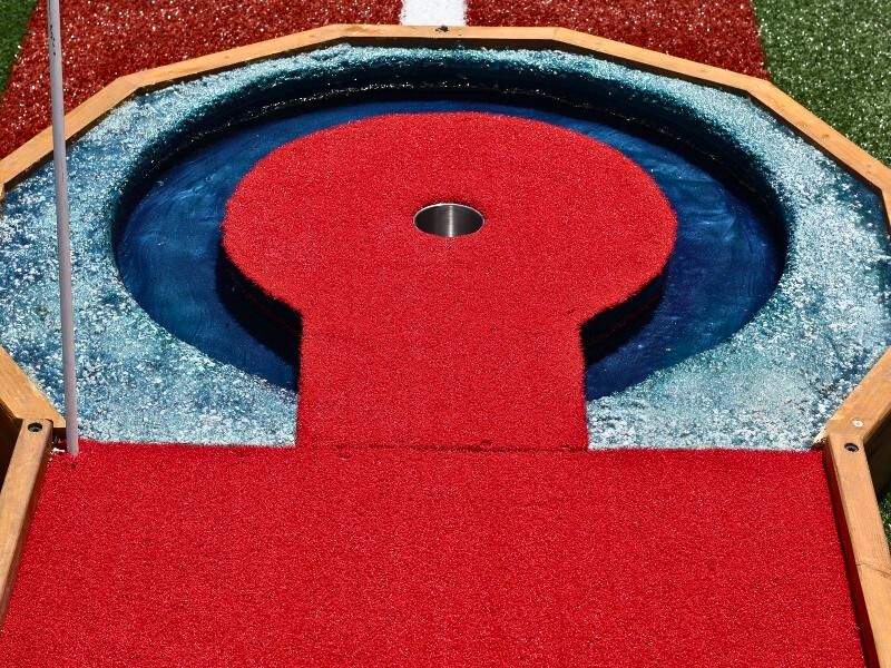 Hole 6 was adorned with the Love Sign and the base of the Love Sign was decorated with the Phillies logo on the front and back sides. Golfers had to choose the proper opening in the Love Sign base, there are three, in order to have their putt pass through the Love Sign base. Hole 7 was another hole where the cup was surrounded with two traps. These traps however were filled with Herr's Potato Chip bags and jutted out in different directions. The last hole of the ones with red turf was Hole 8. This hole was a very straightforward putt to the cup. However, the cup is on a circular surface that is surrounded by water and the cup size is just a little bit larger than the golf ball itself. While a hole in 1 can be achieved, no holes in 1 were scored on this day.