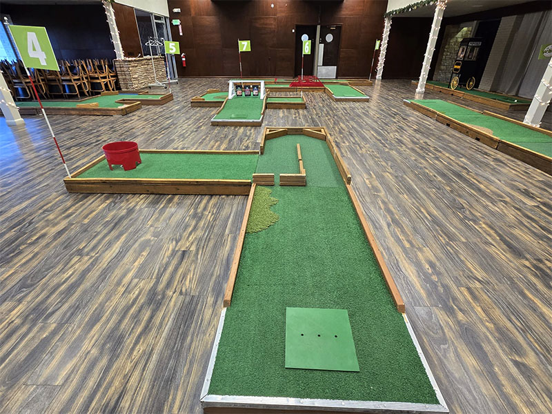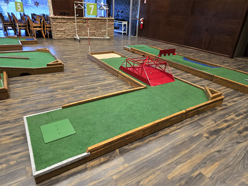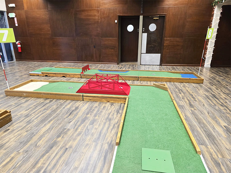 Our last event of the year took us to Monticello, Indiana to provide a custom 9 hole mini golf experience for Wabash Valley Farms for their corporate holiday event. Wabash Valley Farms is a manufacturer of several different types of popcorn as well as gourmet popcorn. Our course designers had that in mind when this course was designed.