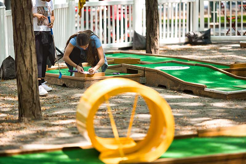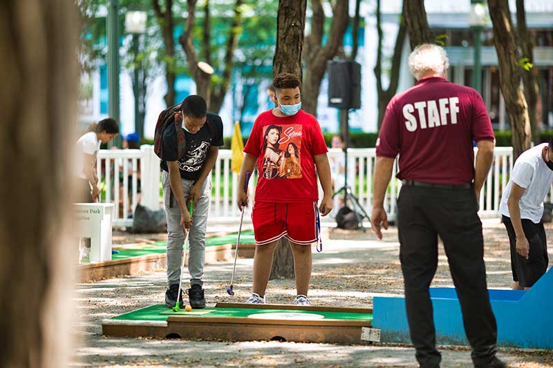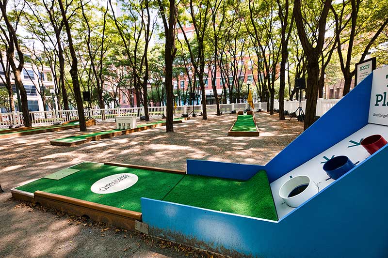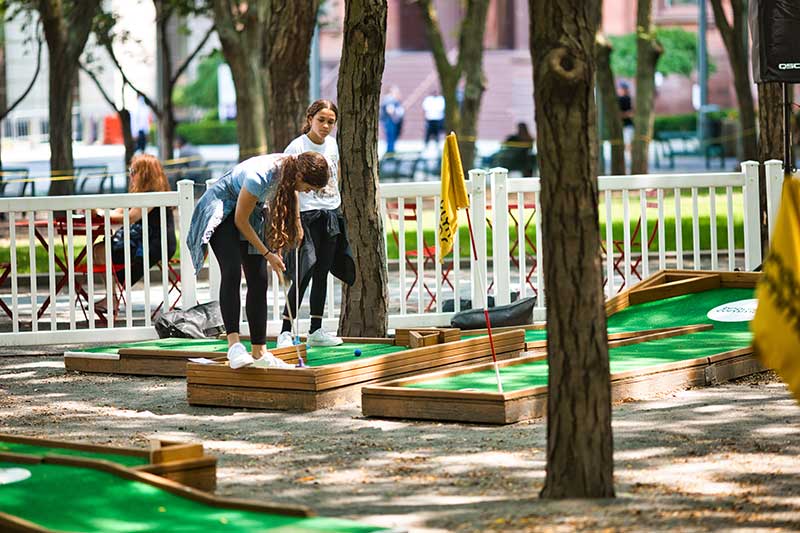 With the success of the long term mini golf installation at Brookfield Place, we were asked to create a 7 hole mini golf rental at Brookfield Properties location in Brooklyn, New York. Previously known as Metrotech, this 16 acre location is comprised of 12 office buildings centered around a common park/plaza area. Since its creation in the 1980's, the common park & outdoor plaza area has become a popular pass through area not just for the individuals working in the 12 office buildings but also for the residents in the nearby growing neighborhood.