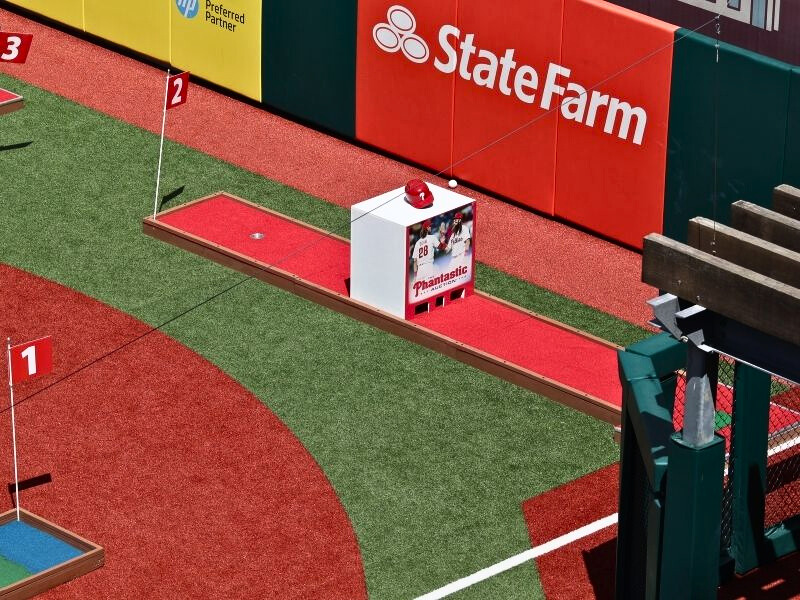 We were once again blessed with a beautiful sunny summer day in late July where our 9 hole course would be installed at the Citizens Phan Field of Citizens Bank Park. Citizens Phan is the wiffle ball field and is the perfect size for creating a custom course. Continuing from earlier in the month with now providing custom colors of turf besides that of green, 6 of the holes for this event were red and the other 3 holes were the traditional green. Holes 1, 5 & 9 were the green holes and these holes each had a Phillies turf logo near the tee area. To start the course, hole 1 was a challenging par 3 with two legs and a branded obstacle that was dangling Herr's potato chip bags to putt through in the first part of the fairways. Hole 5 we labeled the Phillie Phanatic as that was the hole in 2024, where the Phillie Phanatic miraculously was able to get a hole in 1. The last hole of the course was the Skeeball hole which had a branded Skeeball marquee to collect the last shots of the golfers.