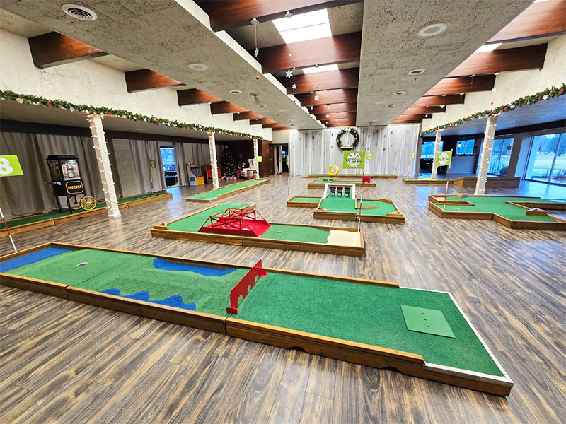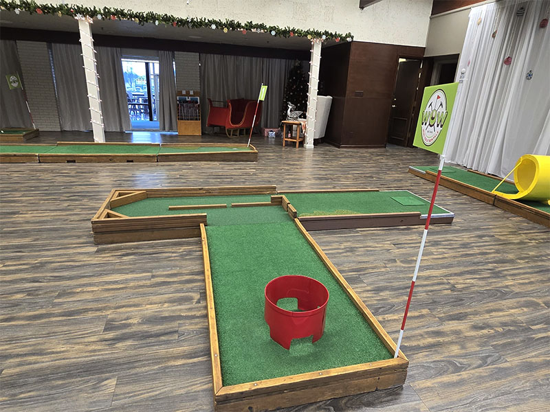 Our last event of the year took us to Monticello, Indiana to provide a custom 9 hole mini golf experience for Wabash Valley Farms for their corporate holiday event. Wabash Valley Farms is a manufacturer of several different types of popcorn as well as gourmet popcorn. Our course designers had that in mind when this course was designed.