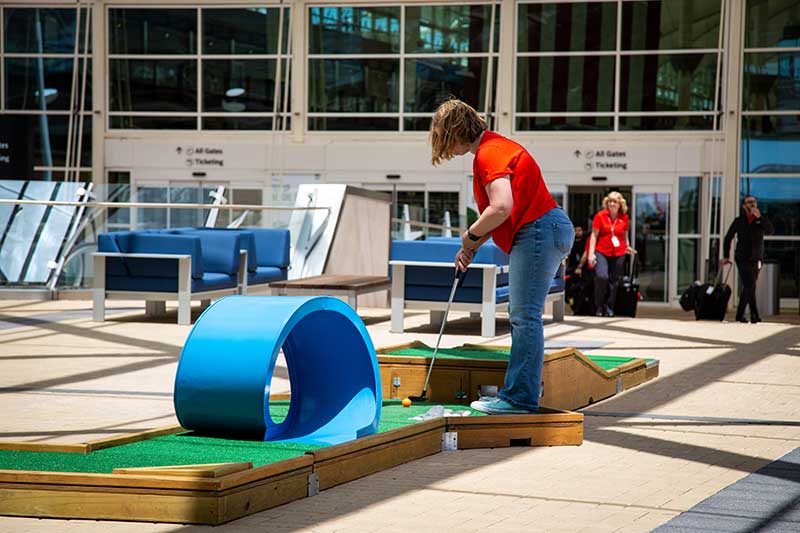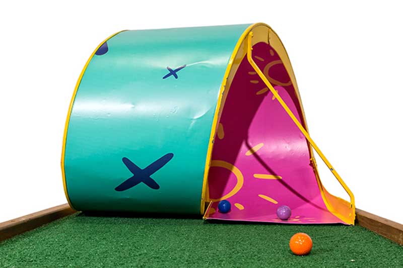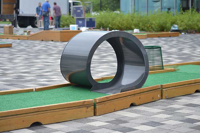 One of the most iconic & classic mini golf obstacles is the Loop De Loop. This metal obstacle is a popular choice on the mini golf rental courses and several event clients have chosen to brand it. The branding options range from color matching it in a variety of colors to applying vinyl to the main surface area.