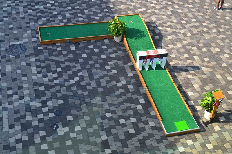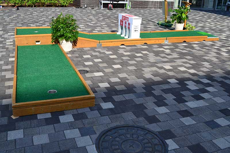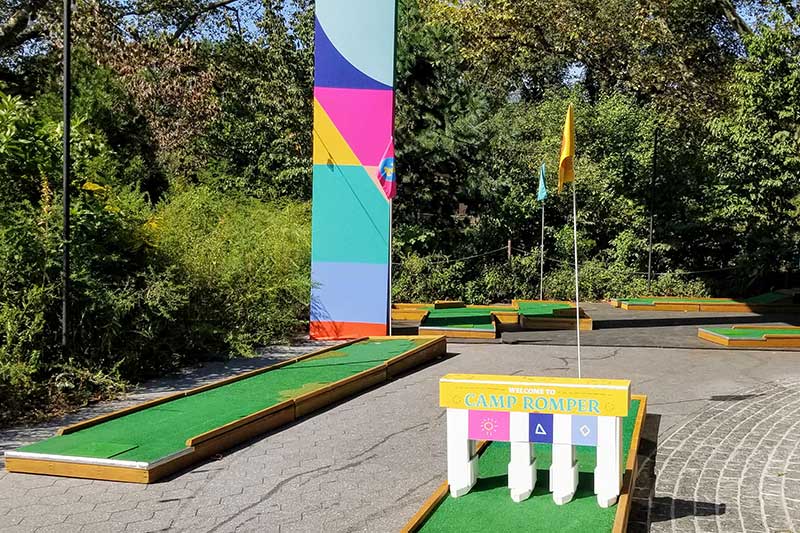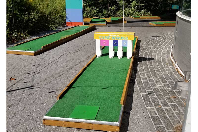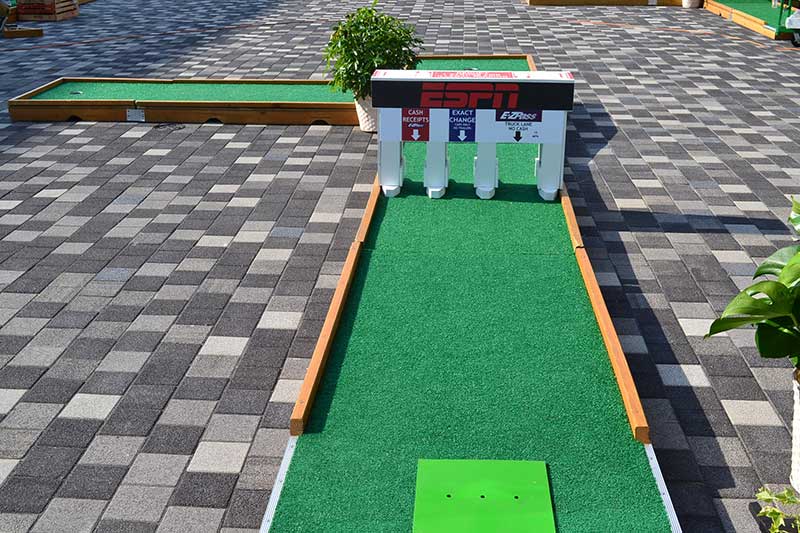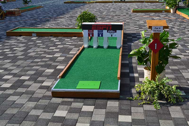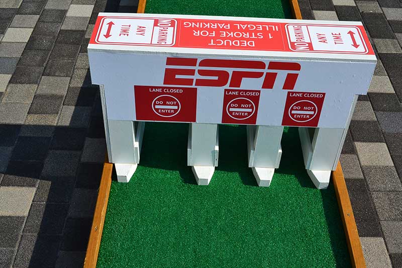 In one of our creative & brainstorming mini golf sessions, our goal was to create additional obstacles that would also provide the opportunity for sponsors and companies to brand it. The obstacle had to provide surface area so that the brands image would be visible as well as be a fun obstacle. One of our staff at the beginning of the meeting stated that he was delayed due to an issue at the Toll Booth. Our meeting progressed and then it struck all of us why not create a Toll Booth obstacle. Toll Booths have a lot of area that can be branded and the lanes would be the choices for players to putt through. The EZ Pass truck lanes would be the widest for the golf ball to go through, the EZ Pass for cars would be the next widest lane to putt through and finally the Cash lane would be the narrowest lane to putt through.